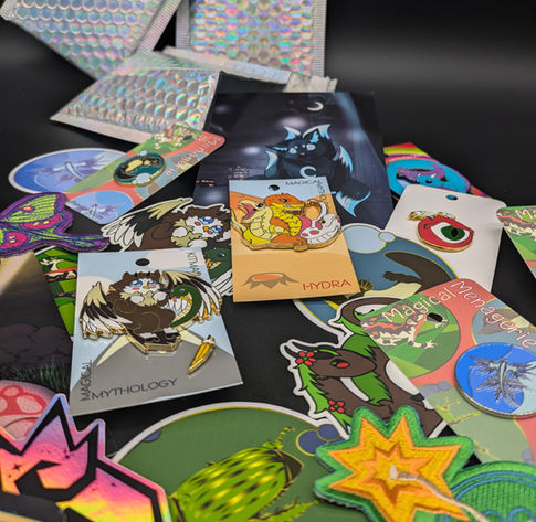 Not sure what you're looking for? Interested in a cool surprise? Maybe you should try a Mystery Pack! Mystery Packs come in different sizes depending on what you're in the mood to explore. Each pack had a variety of fun and unique products from my catalog including large vinyl stickers, custom iron-on patches, enamel pins, pendant necklaces, and other art products not available any other way.